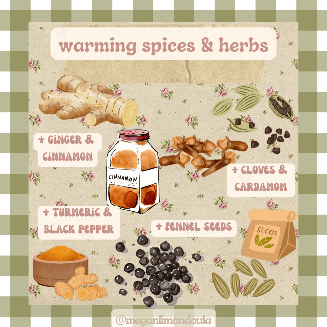 Warming spices are central to postpartum healing: they stimulate digestion, improve circulation, and keep the body warm. These are ideal for soups, porridges, teas, and roasted vegetables.