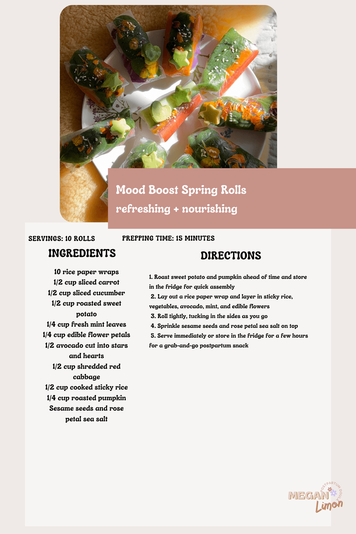 Postpartum days can feel slow, low-energy, and heavy on routine. Snacks like these spring rolls are a way to bring joy, color, and gentle nourishment to your plate while supporting energy, mood, and digestion
