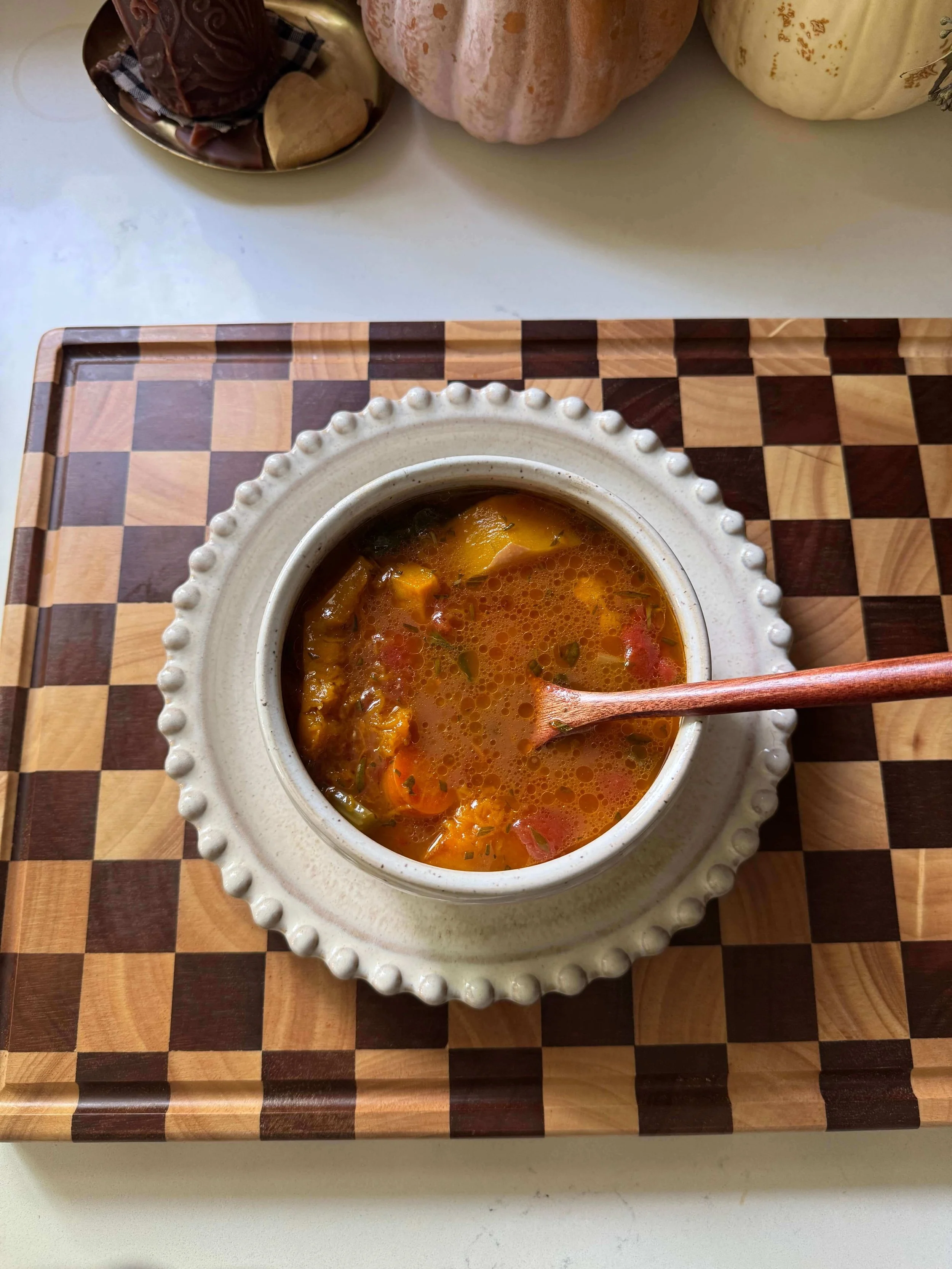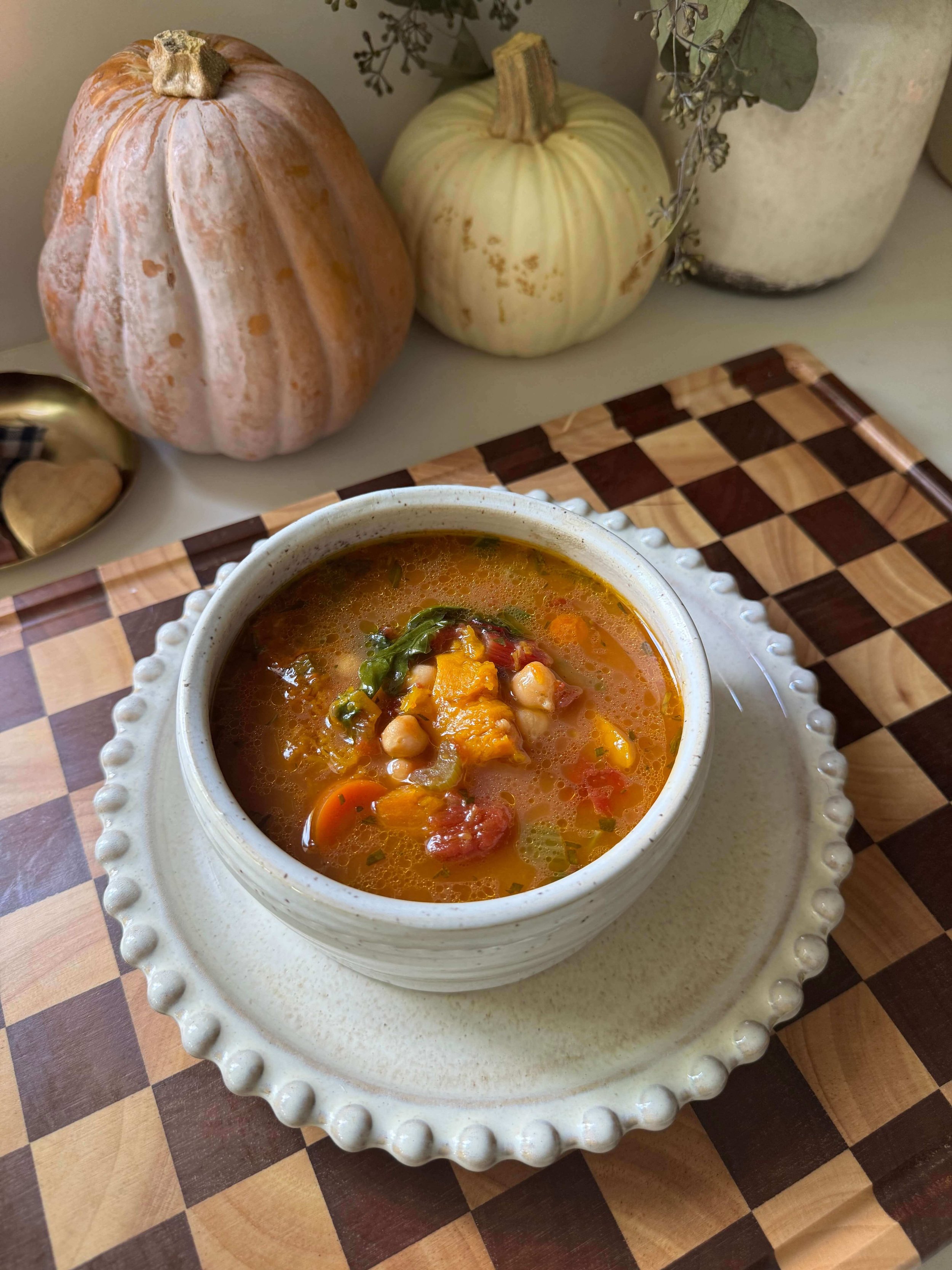 Today’s recipe is one of my favorites: my Garden Veggie Autumn Soup. It’s packed with chickpeas, roasted butternut squash, garden greens, and aromatic herbs, with coconut milk adding a creamy touch that makes every spoonful comforting and rich. It’s hearty enough for dinner but still feels light and nourishing. the perfect bowl to bring you back to center on a cool day.
