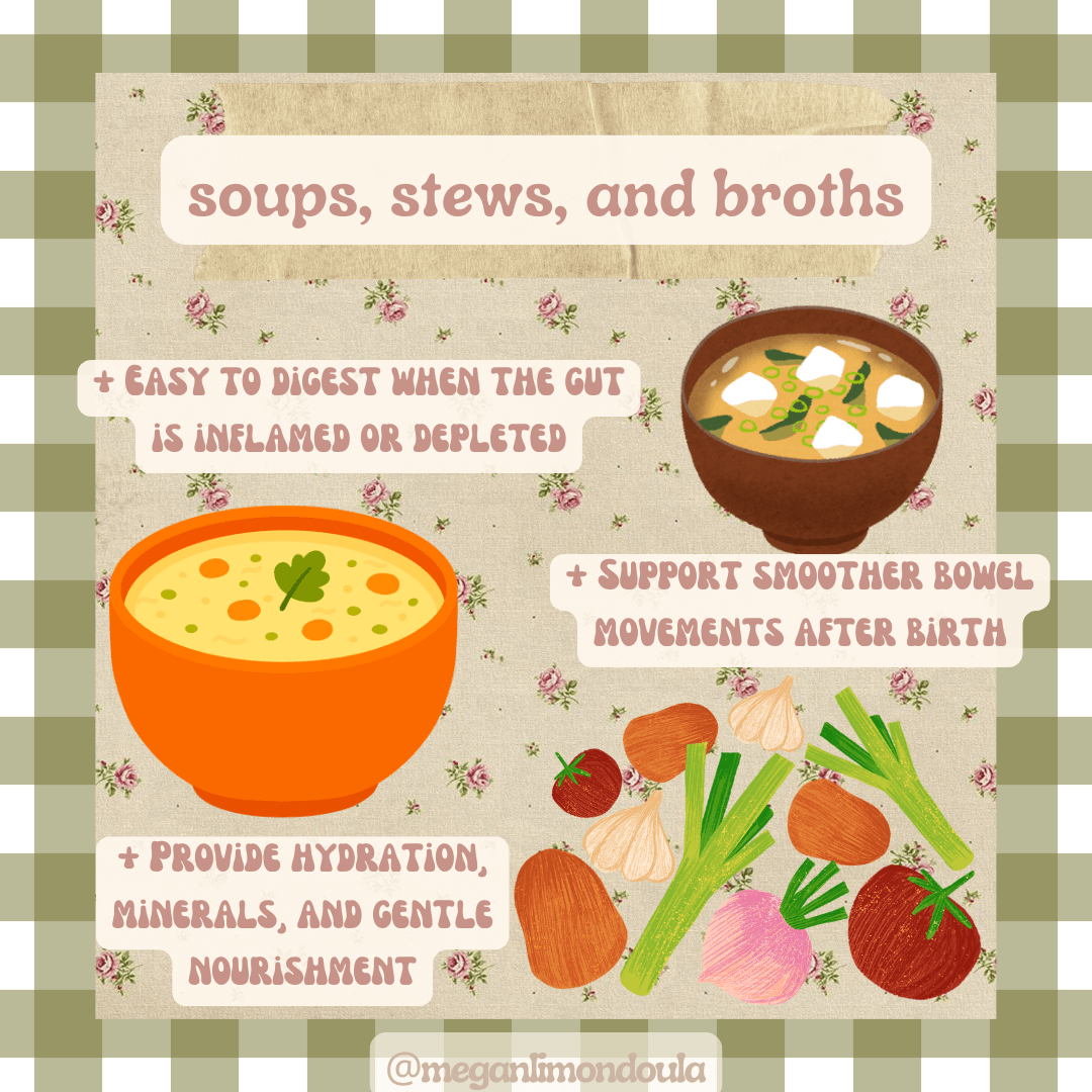Liquid and semi-liquid meals are ideal in the early postpartum weeks. They help soften stools, reduce digestive strain, and support the first post-birth bowel movements π€