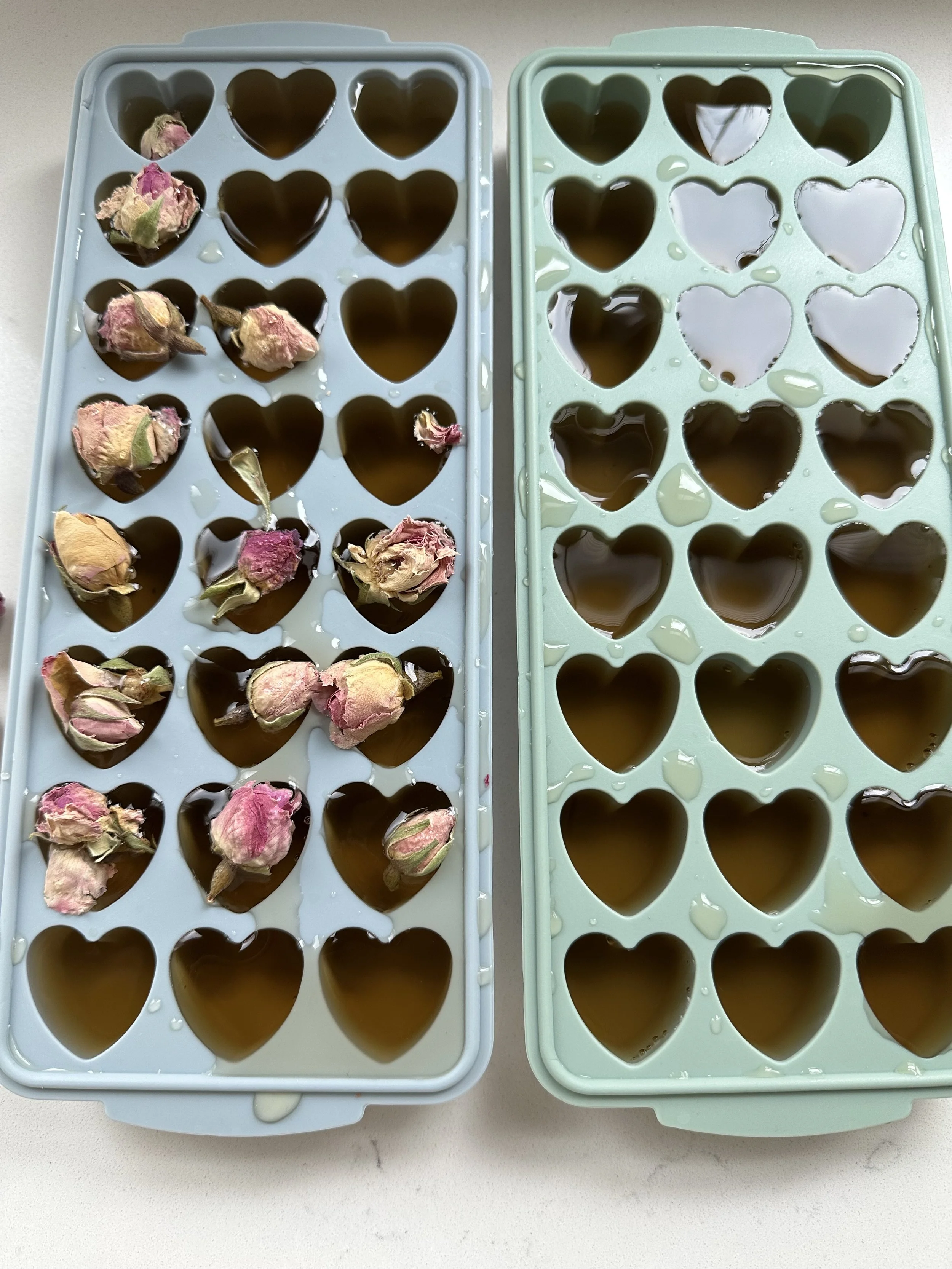 In a large pot, boil water. Once water is boiled, pour in herbs and allow to steep for 3-4 hours with the pot lid on. Once cooled, pour herbal blend through a strainer to get all the tea SEPARATED. Pour tea into ice cube trays and place into the freezer. allow to freeze overnight. these cubes are fresh for 1-2 months.