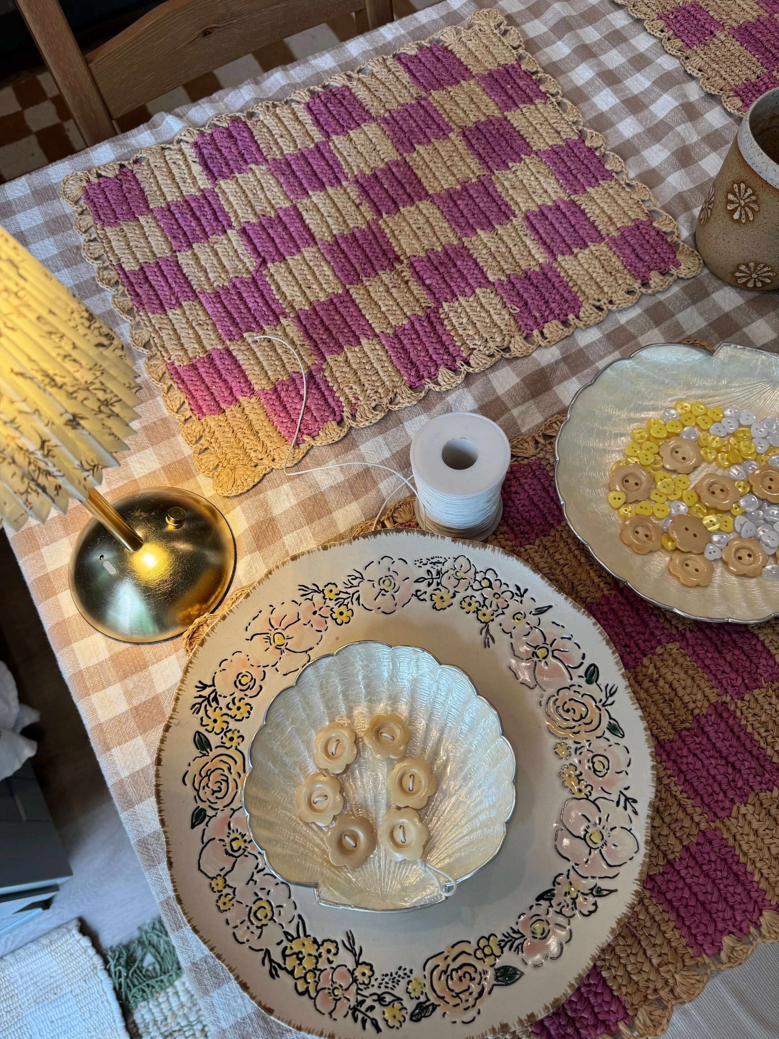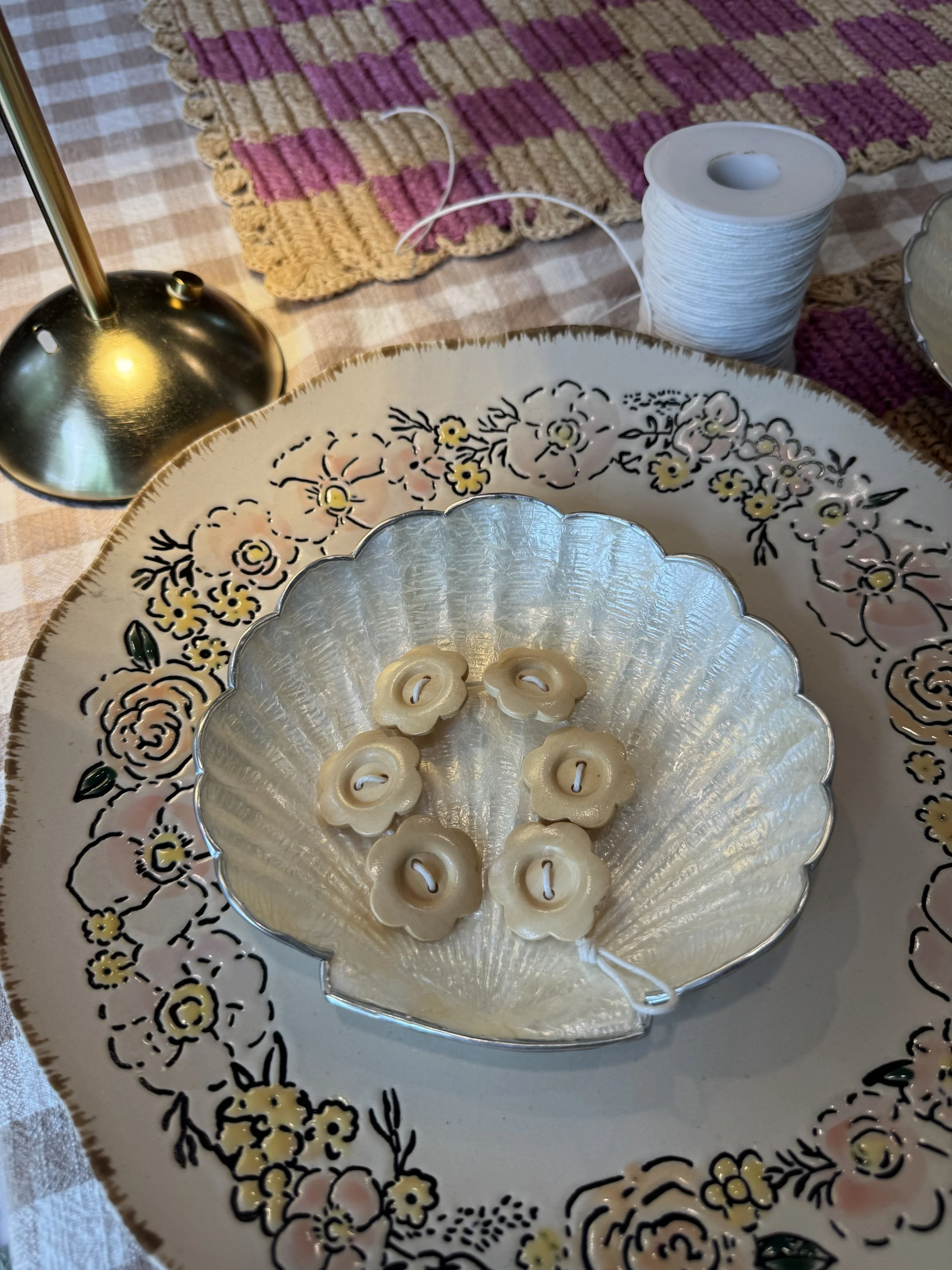 Maybe it’s a little stretch *literally* but you deserve so much more than a hair elastic on the wrist. Making a simple bracelet with buttons really is such a nod to our childhoods, no? I use to make these bracelets all the time but this one has a fun little twist. I found simple wooden buttons in a flower shape and used a waxed cotton cord that will last atleast six weeks! 🥹