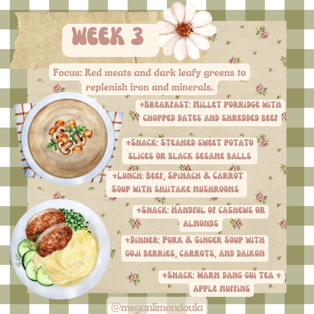 This week focuses on replenishing iron and minerals lost during birth. Dark leafy greens, red meats, and mineral-rich broths take center stage.
