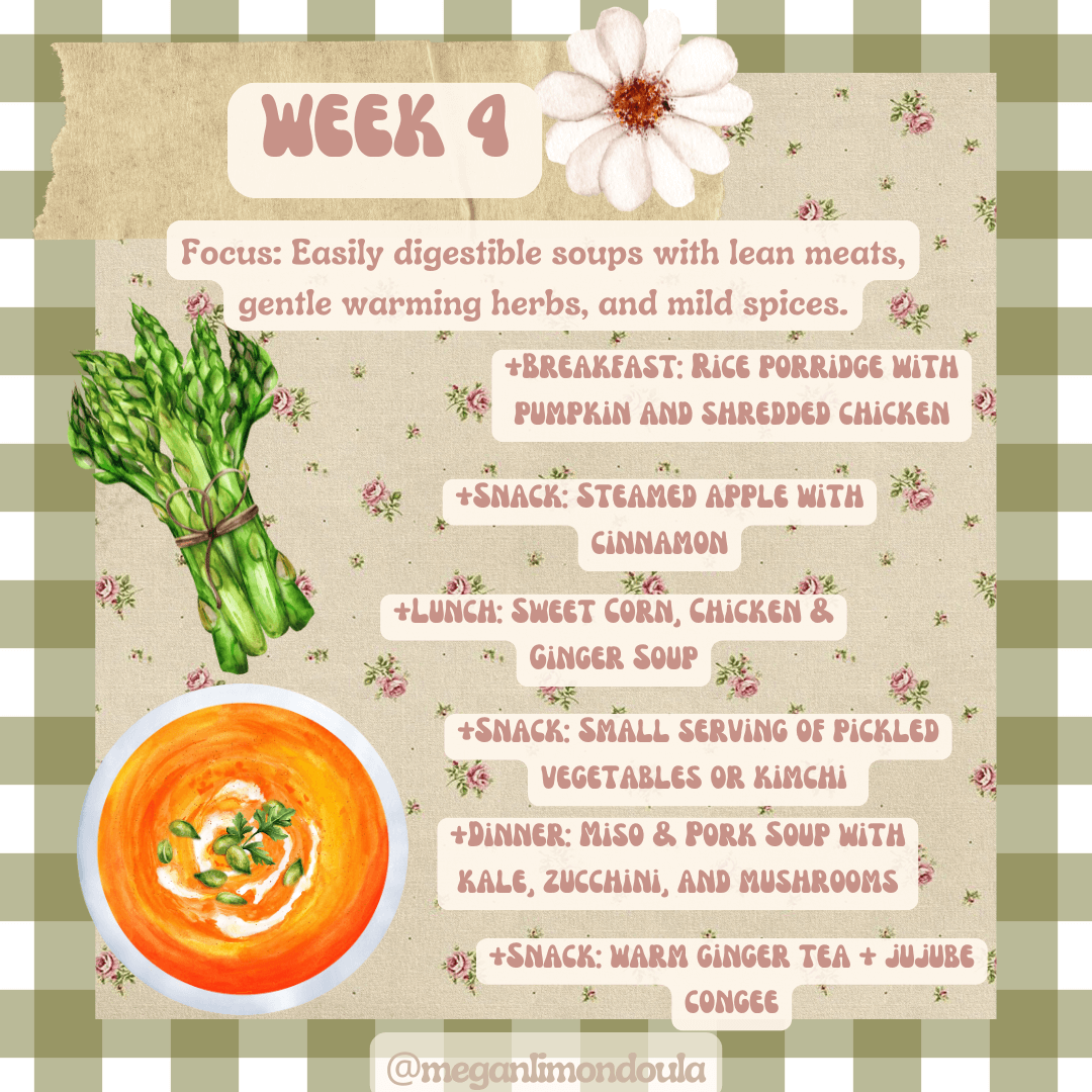Digestive health is key to postpartum recovery. This week focuses on soothing soups that strengthen the gut while still keeping meals warm and gentle.